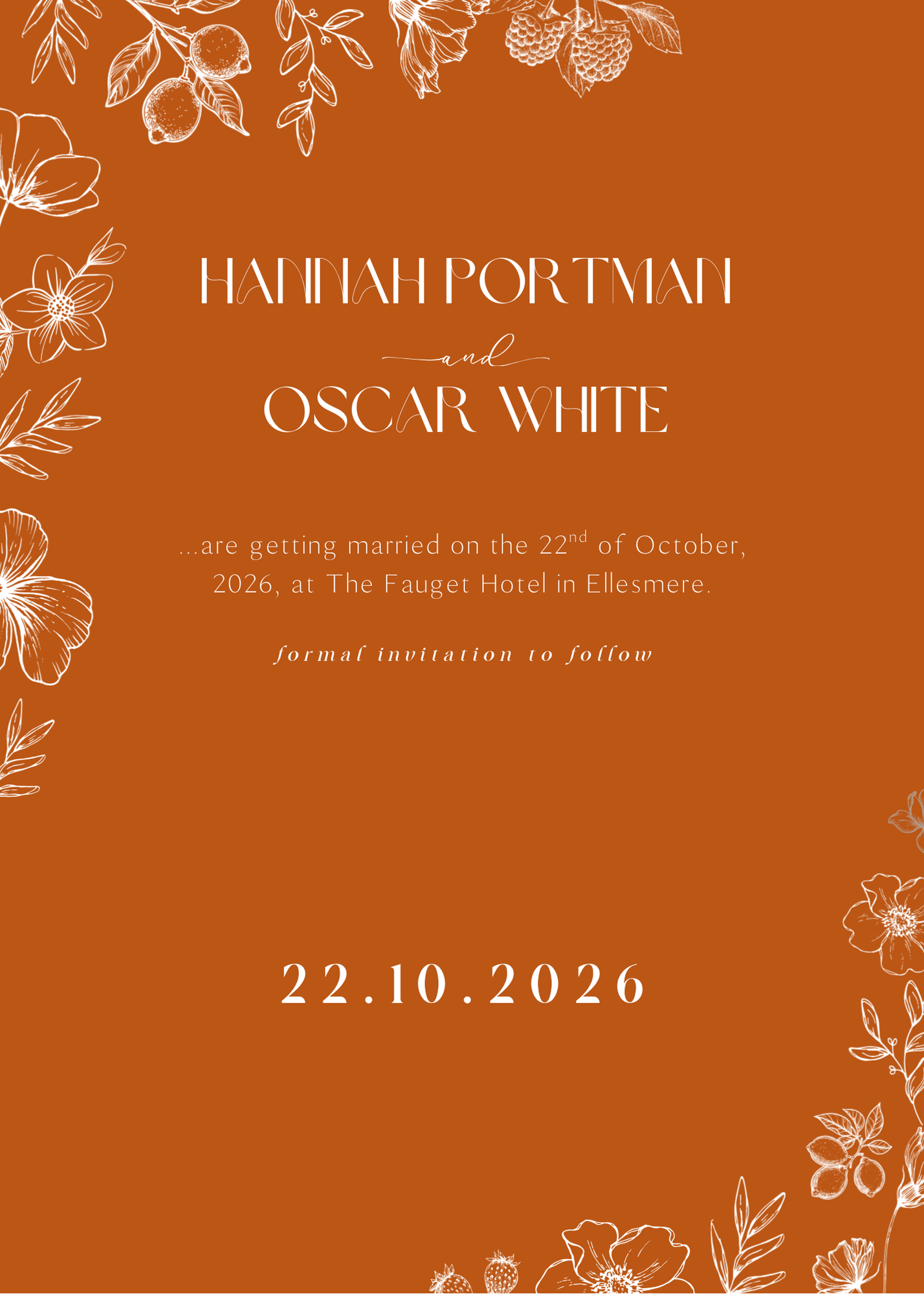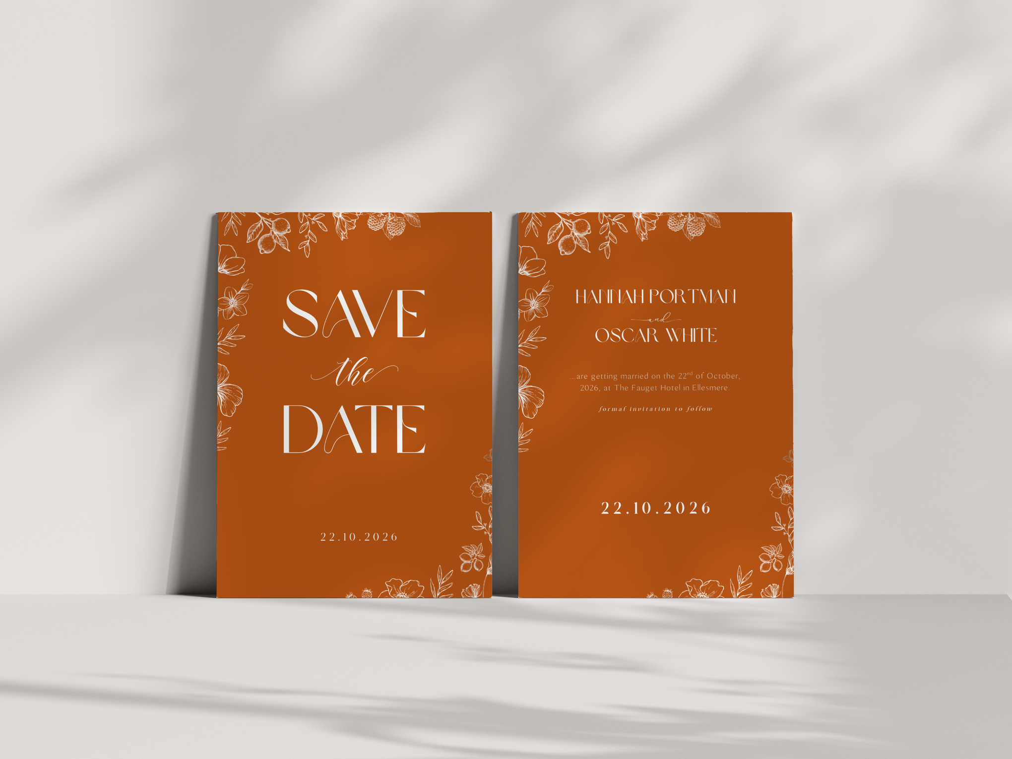Personalised Toasted Amber Save the Date card 5x7 inch wedding stationery with burnt orange background and white botanical design