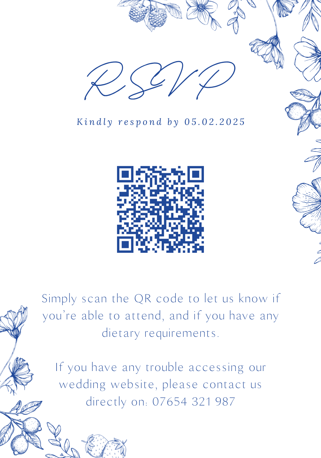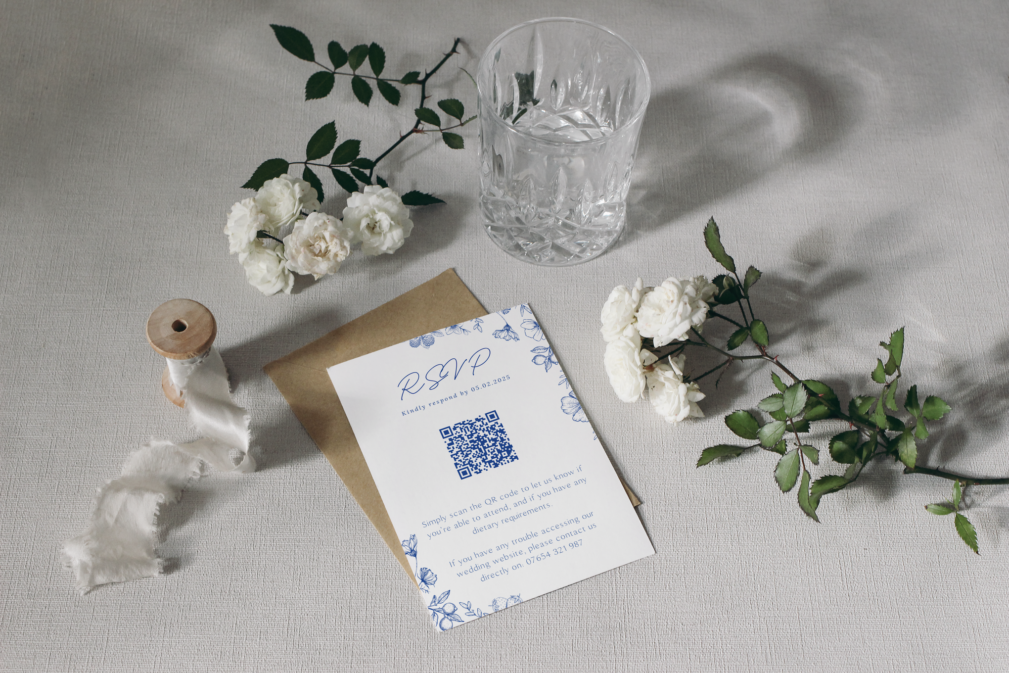 Personalised Santorini QR code RSVP card A6 wedding stationery with blue botanical sketches and custom photo front