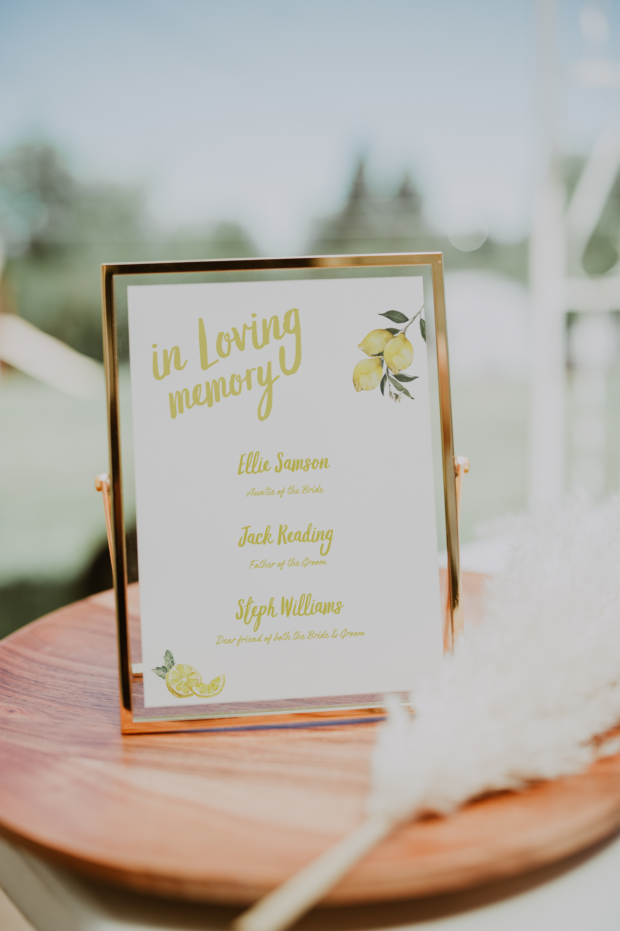 Limoncello in loving memory wedding table sign with lemon watercolour illustrations and yellow script text